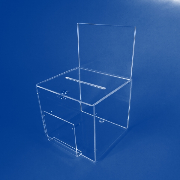 - In unserem Sortiment haben wir auch Sammelboxen mit der Möglichkeit in deren Vorderseite ein Plakat einzuschieben, z. B. zur Produktinformation oder zur Erklärungen Ihrer Spendenaktion. Das Plakat kann einfach entnommen werden und die Beschriftung somit verschieden oft ausgewechselt werden.