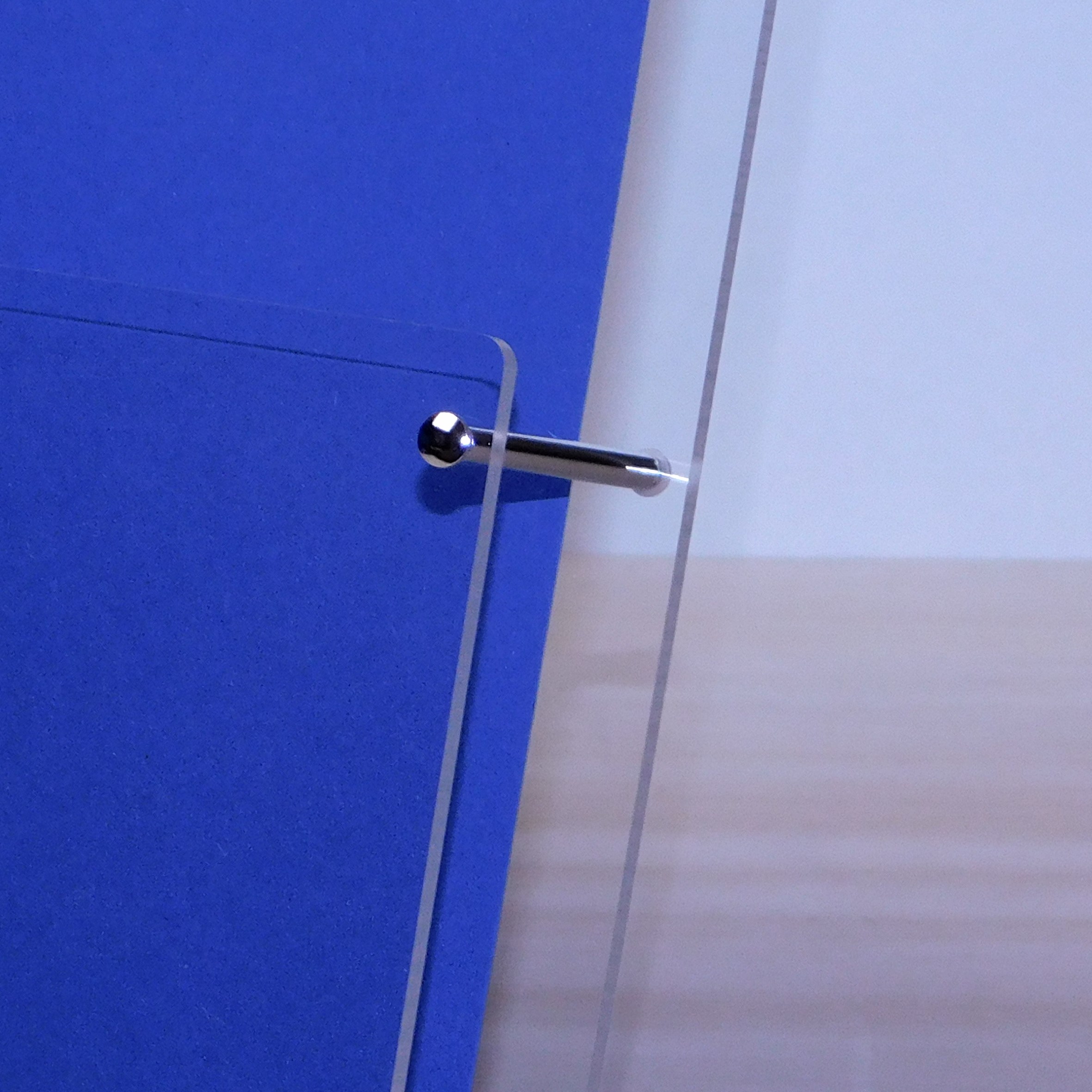 Kanten geschliffen, Ecken gerundet. Die Seitenteile des Tischaufstellers sind mit Metallstiften im Edelstahl-look
