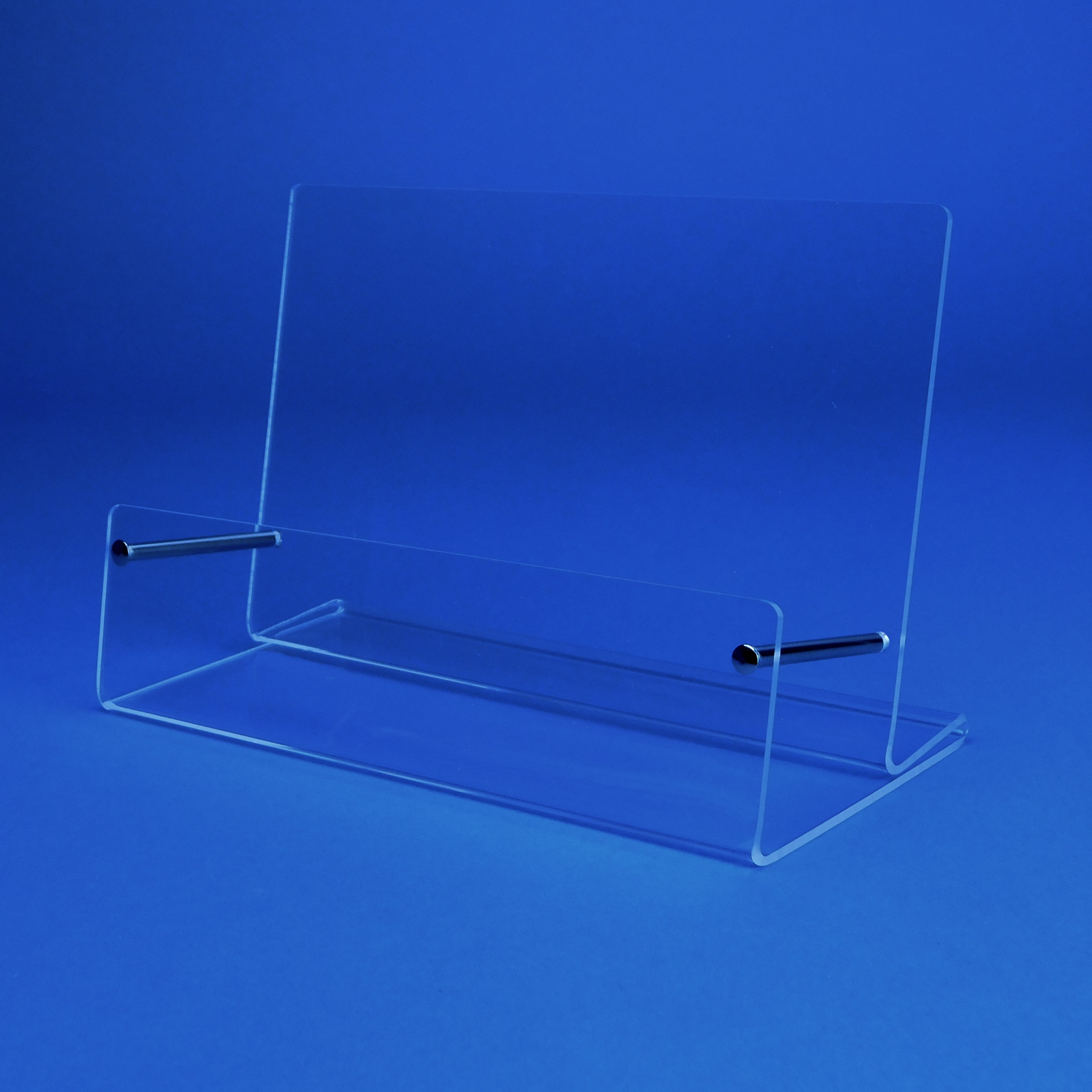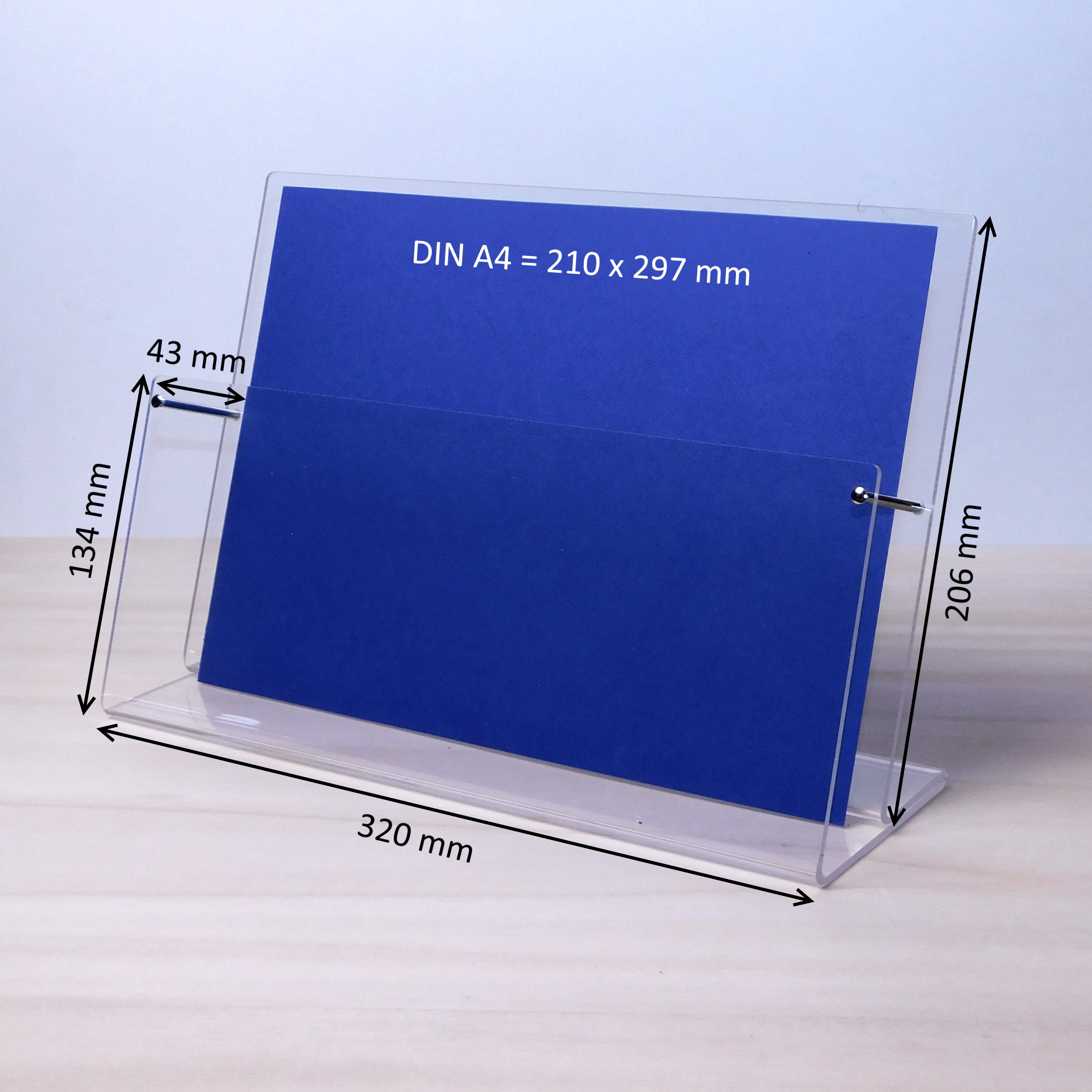Infoständer passend für Blätter in DIN A4 Querformat = 297mm breit, 210mm hoch. Tischprospekthalter aus Acryl klar, kein Vergilben mit 30 Jahren Garantie,