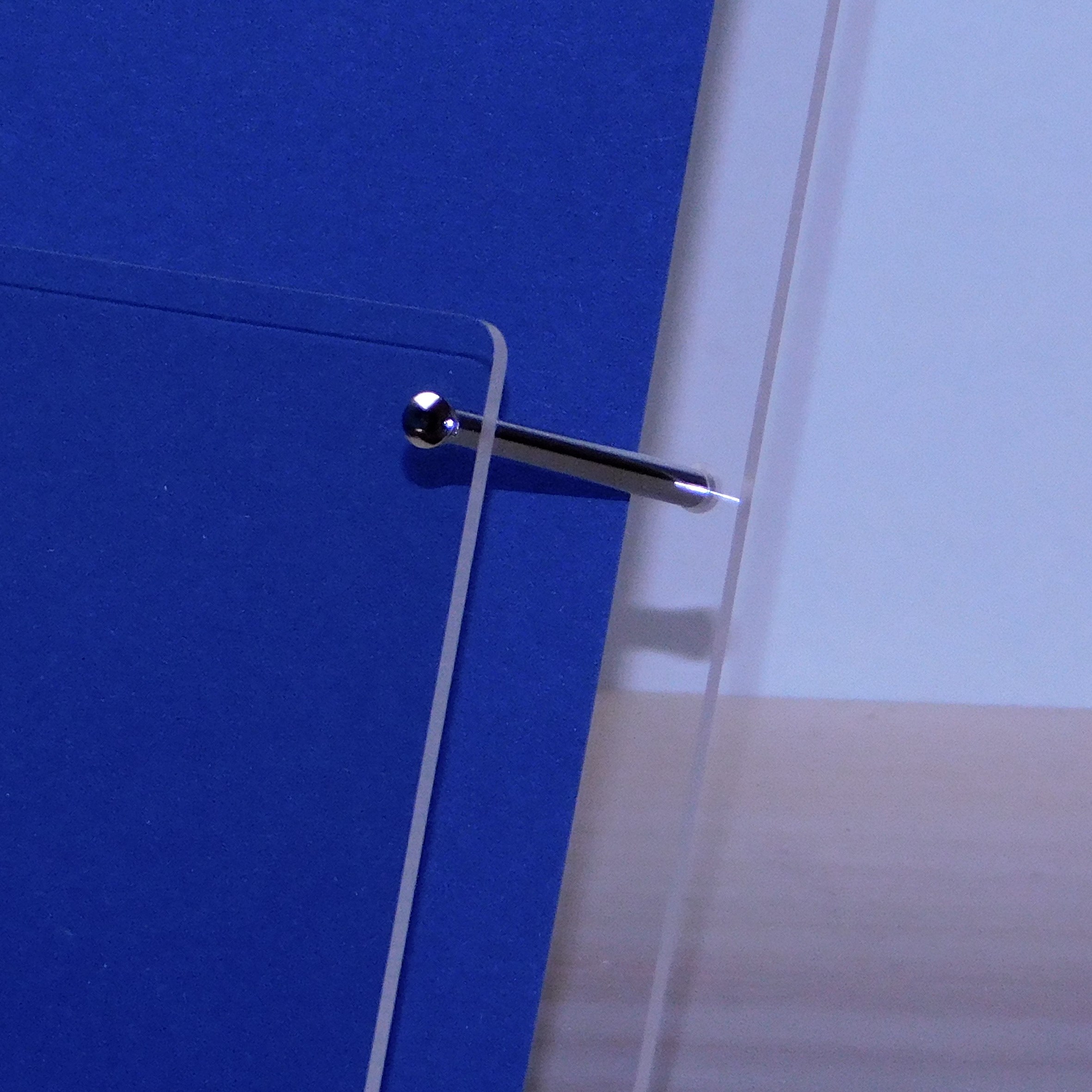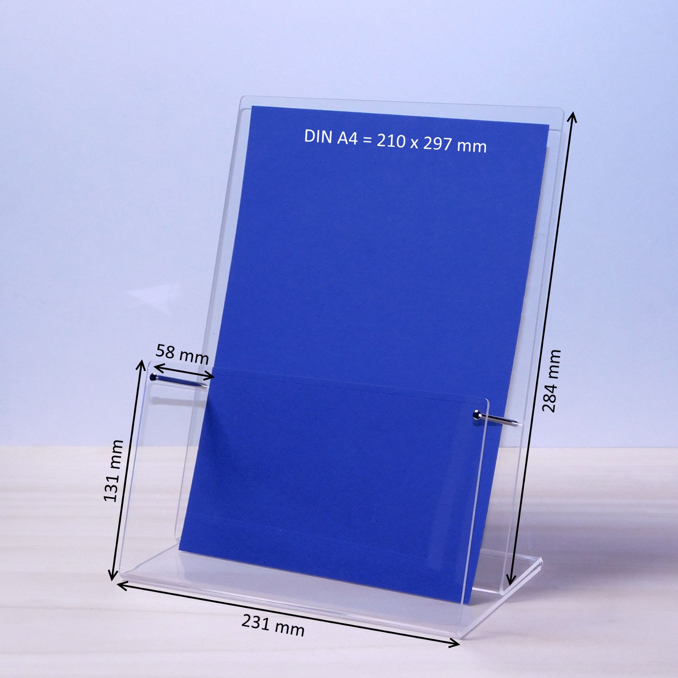 Infoständer passend für Blätter im DIN A4 Hochformat = 210mm breit, 297mm hoch, aus Acryl klar, kein Vergilben mit 30 Jahren Garantie,Kanten geschliffen, Ecken gerundet. Tischprospekthalter mit Seitenteilen mit Metallstiften im Edelstahl-look