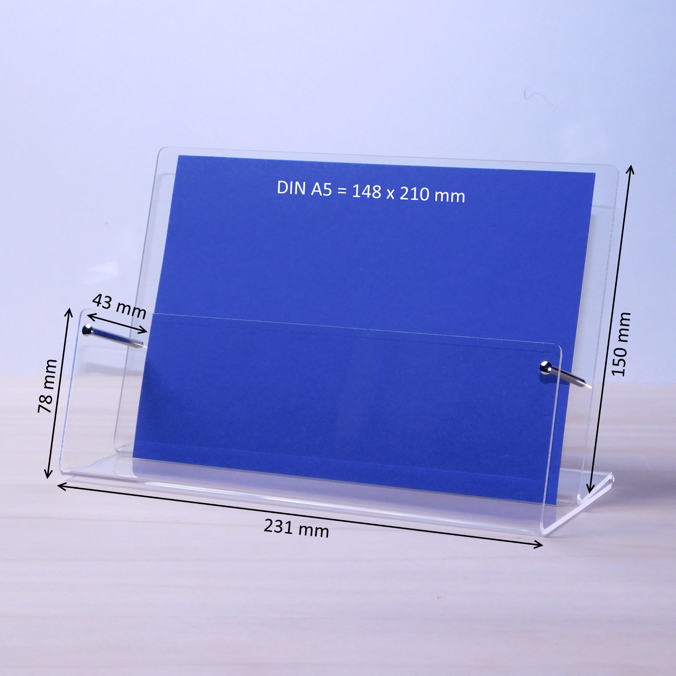 Thekenaufsteller passend für Prospekte im DIN A5 Querformat = 210mm breit, 148mm hoch. Infoständer aus Acryl 2mm klar, kein Vergilben mit 30 Jahren Garantie, Kanten geschliffen, Ecken gerundet. Der Tischprospekthalter hat Seitenteile mit Metallstiften im Edelstahl-look