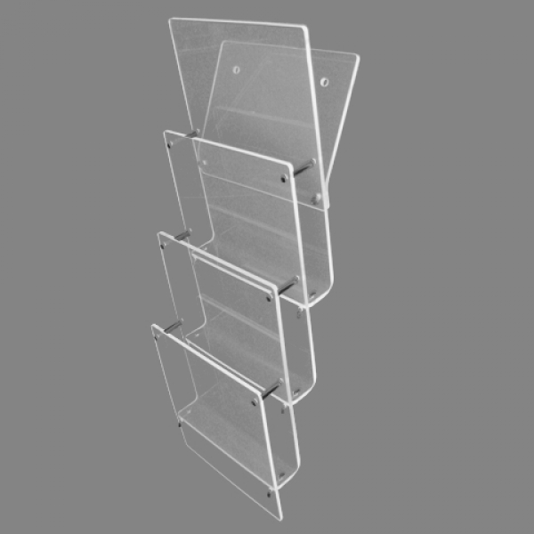 3-fach Wand Prospekthalter DIN A4 Hochformat untereinander3 Fächer untereinander in DIN A4 Hochformat = 210mm breit x 297mm hochInnenmaße: Breite 214mm, Höhe 297mm, Tiefe 23mm Außenmaße: Breite 230mm, Höhe 640mm, Tiefe 80mmund einer Fülltiefe von 23mm mit 2 Bohrlöchern zur Wandbefestigung Durchmesser 5mmaus Acryl 3mm klar, kein Vergilben mit 30 Jahren Garantie,Kanten geschliffen, Ecken gerundetSeitenteile mit Metallstiften im Edelstahl-look