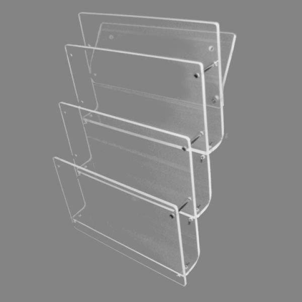 3-fach Wand Prospekthalter DIN Lang Querformat untereinander 3 Fächer untereinander in DIN Lang Querformat = 210mm breit x 105mm hoch Innenmaße: Breite 214mm, Höhe 105mm, Tiefe 23mm Außenmaße: Breite 230mm, Höhe 244mm, Tiefe 80mmund einer Fülltiefe von 23mm mit 2 Bohrlöchern zur Wandbefestigung Durchmesser 5mmaus Acryl 3mm klar, kein Vergilben mit 30 Jahren Garantie, Kanten geschliffen, Ecken gerundet Seitenteile mit Metallstiften im Edelstahl-look