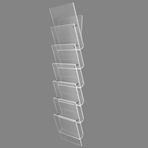 6-fach Wand Prospekthalter DIN Lang Hochformat untereinander 6 Fächer untereinander in DIN Lang Hochformat = 105mm breit x 210mm hochInnenmaße: Breite 109mm, Höhe 210mm, Tiefe 23mm Außenmaße: Breite 119mm, Höhe 787mm, Tiefe 80mmund einer Fülltiefe von 23mm mit 2 Bohrlöchern zur Wandbefestigung Durchmesser 5mmaus Acryl 3mm klar, kein Vergilben mit 30 Jahren Garantie,Kanten geschliffen, Ecken gerundet Seitenteile mit Metallstiften im Edelstahl-look