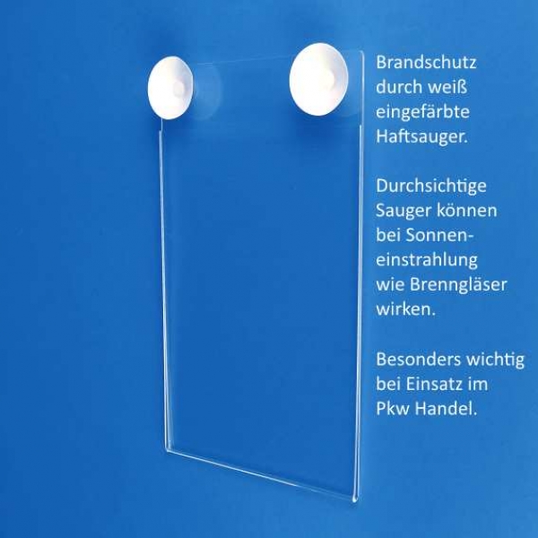 Plakattasche DIN A4 Hochformat mit 2 Haftsaugern Passend für Einlegeformat DIN A4 Hochformat = 210mm breit x 297mm hochmit 2 Haftsaugern Durchmesser 38mm zur Befestigung auf Glas Aus Acryl 2mm klar, unser Acryl vergilbt nicht mit 30 Jahren GarantieKanten geschliffen, Ecken gerundet